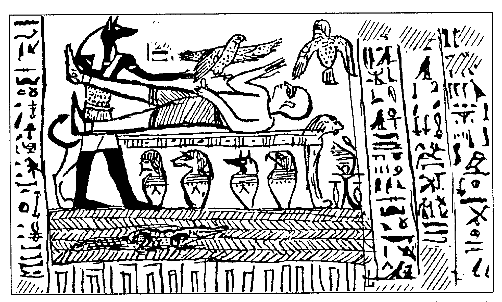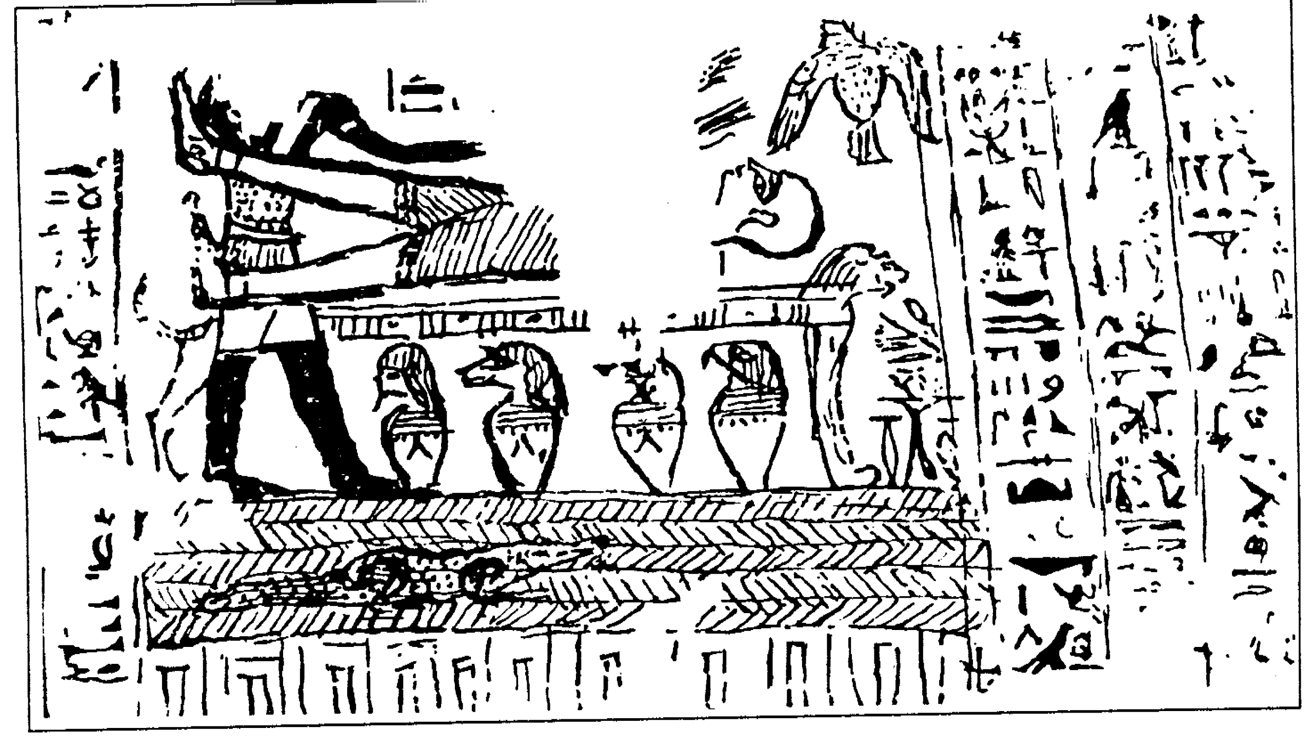 A „Halottak könyve” 125. fejezetének képe az Ozirisz-mítoszra utal. Eszerint Széth megöli Oziriszt, akinek a felesége, Ízisz a – holtan is nemzőképes – Oziriszre madárként rászáll, hogy megtermékenyüljön, fiuk Hórusz lesz, akinek négy fia születik. Széth feldarabolja Ozirisz holttestét, de Ízisz összeragasztja és feléleszti. Ozirisz az alvilág ura lesz, de az igaz halottak lelke is „Ozirisszá” válik. Ezekből a pogány temetkezési szövegekből és illusztrációikból sok példány maradt fenn különböző dinasztiák korából. Kisebb eltérésekkel mind ugyanarról szólnak, és képeik mind ugyanazokat a jeleneteket ábrázolják.